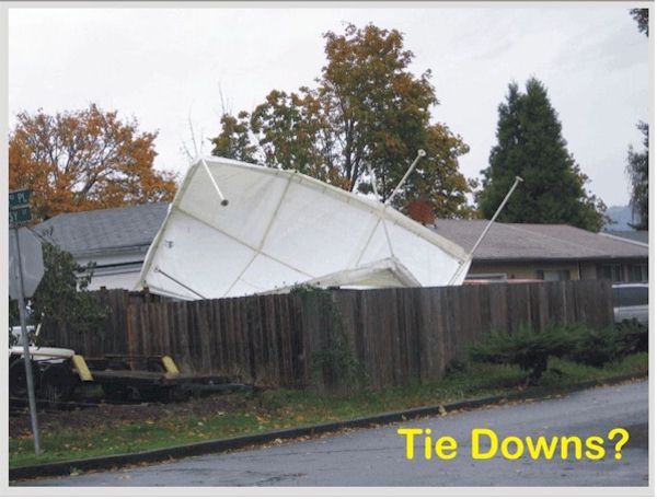 This is not a Creative Shelters canopy but it shows what can happen as a result of light winds when a canopy is improperly anchored. Be sure to anchor all canopies.